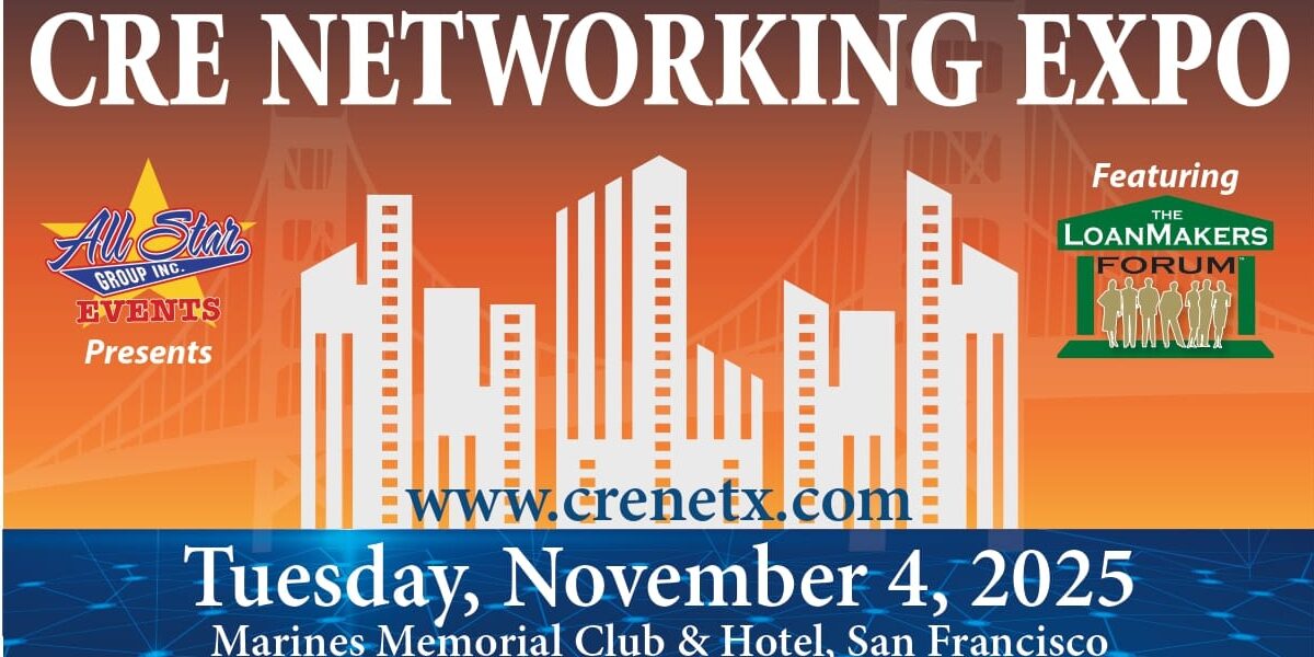 💼 JOIN US AT THE CRE NETWORKING EXPO! All Star Group Events presents an exciting afternoon of networking, collaboration, and industry insights at the CRE Networking Expo featuring The LoanMakers Forum™ — happening Tuesday, November 4, 2025, at the Marines Memorial Club & Hotel, San Francisco. Connect with top lenders, brokers, investors, and commercial real estate professionals for live presentations,